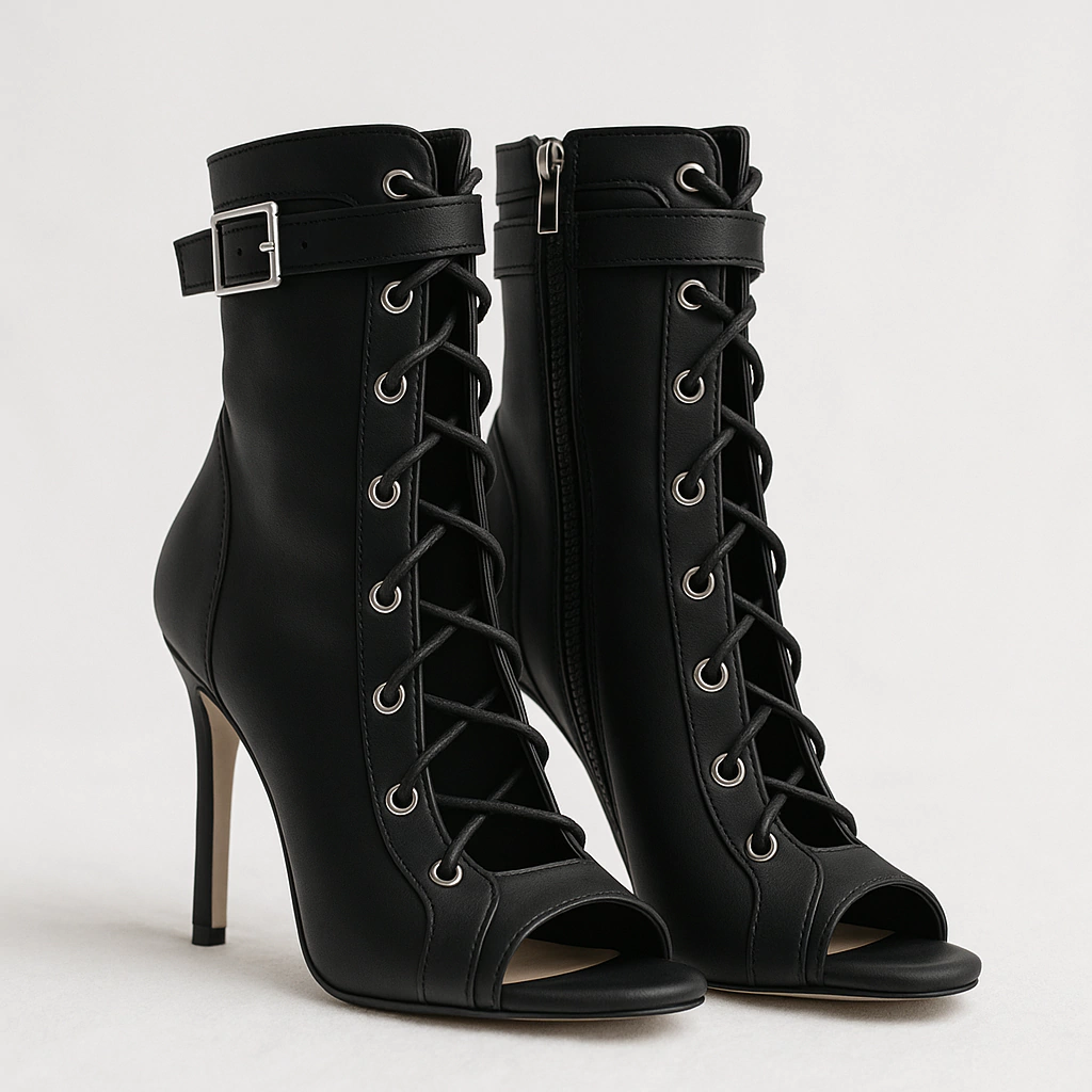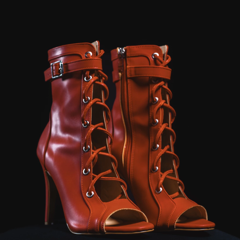 Janeth no susurra, ordena. Su silueta ceñida en cuero vegano rojo es una provocación con tacón, una declaración que se ata con cada cruce de cordones. La piel se funde con el deseo y el diseño deja entrever lo suficiente como para convertir cada paso en una tentación.
